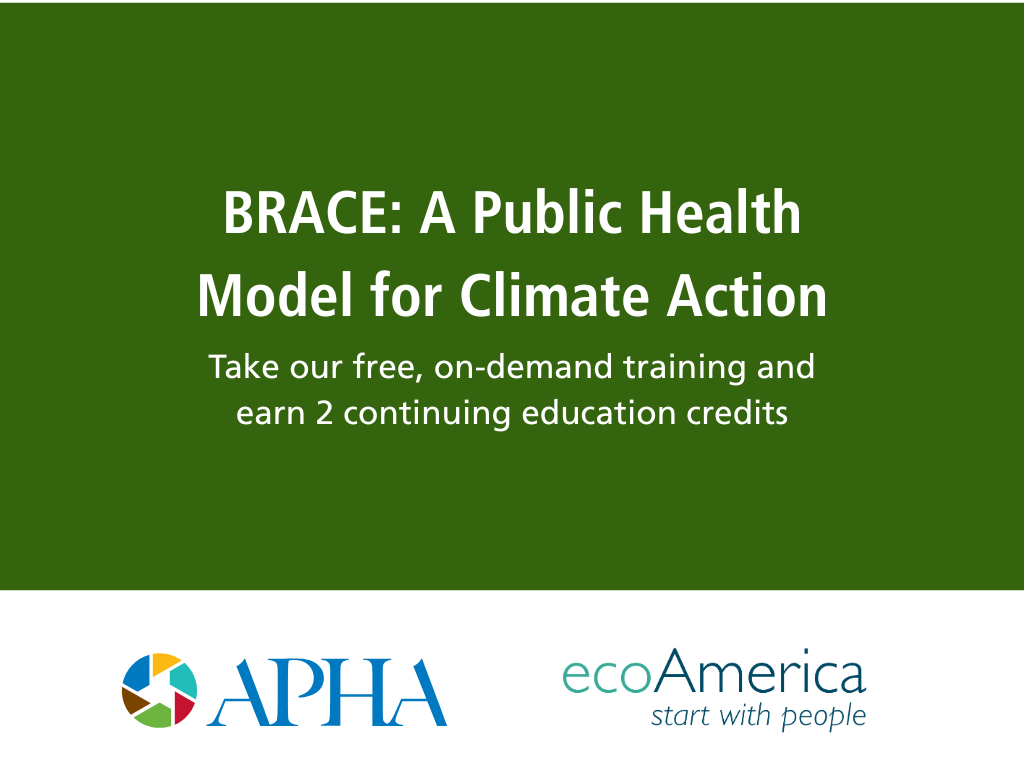 BRACE helps health professionals and health departments at all jurisdictional levels partner with communities to assess climate and health threats, co-develop effective strategies, and act to promote health and climate resilience.